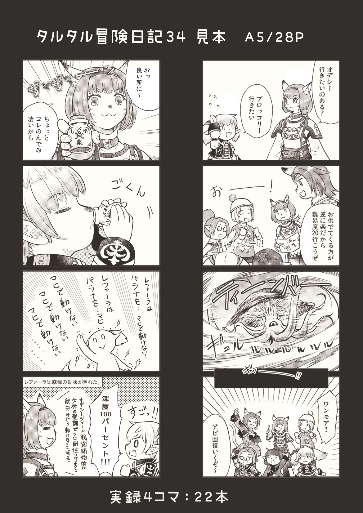 C107新刊の見本ページ「タルタル冒険日記34」A5/28P/オフセット印刷ゲスト:やみなべ様・しゃび様今回は実録マンガ多めタルタル冒険してる日記になりました!コミケwebカタログ→webcatalog-free.circle.ms/Circle/2201823...ゲストお二人には、あなたの推したちを存分に描いて!と伝えたのだけどなんと、わたしの推しが登場するお話を描いてくれて卒倒しました。五体投地!幸せをありがとうありがとう✨**続き物ではなくバックナンバーです。(何冊だしたか自分でわかるように)通販準備が整いましたら追記します。宜しくお願いします(=´w`=)#ヴァナ学 #コミケ #C107 2025.12.25(Thu) 20:05:44 ヴァナ学,日記,絵,漫画,サンプル edit